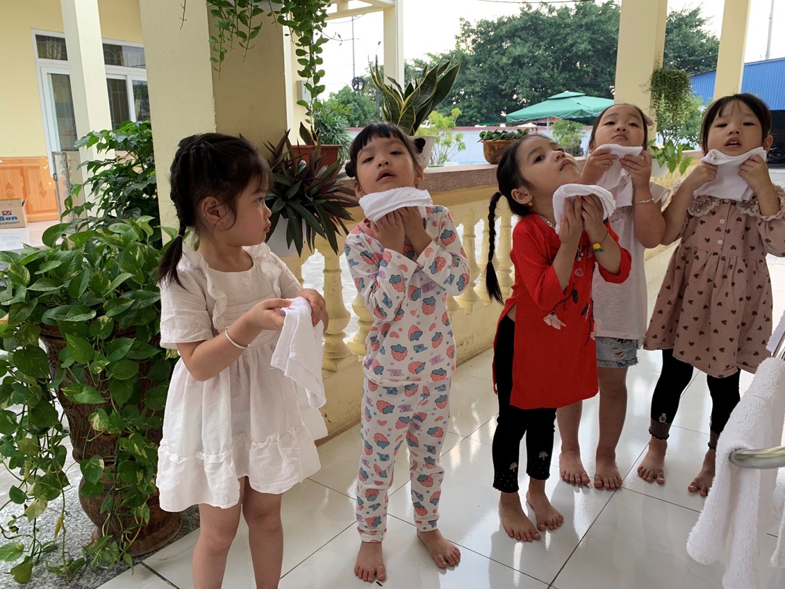 Các bé 4 tuổi B1 luôn thực hiện thường xuyên nghiêm túc thói quen rửa tay rửa mặt hàng ngày.