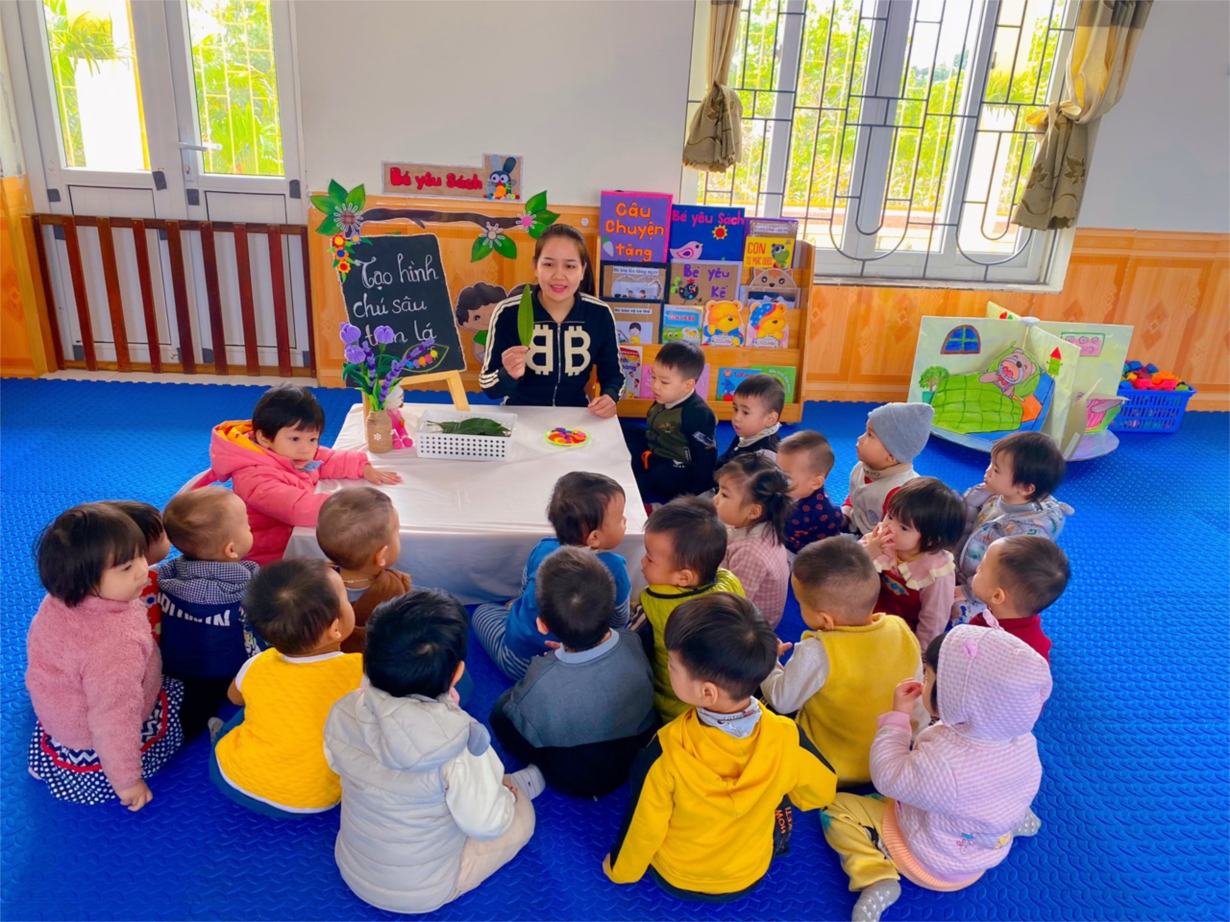 nhà trẻ 1 đã thực hiện một hoạt động tạo hình đầy sáng tạo – tạo hình chú sâu trên lá cây.
