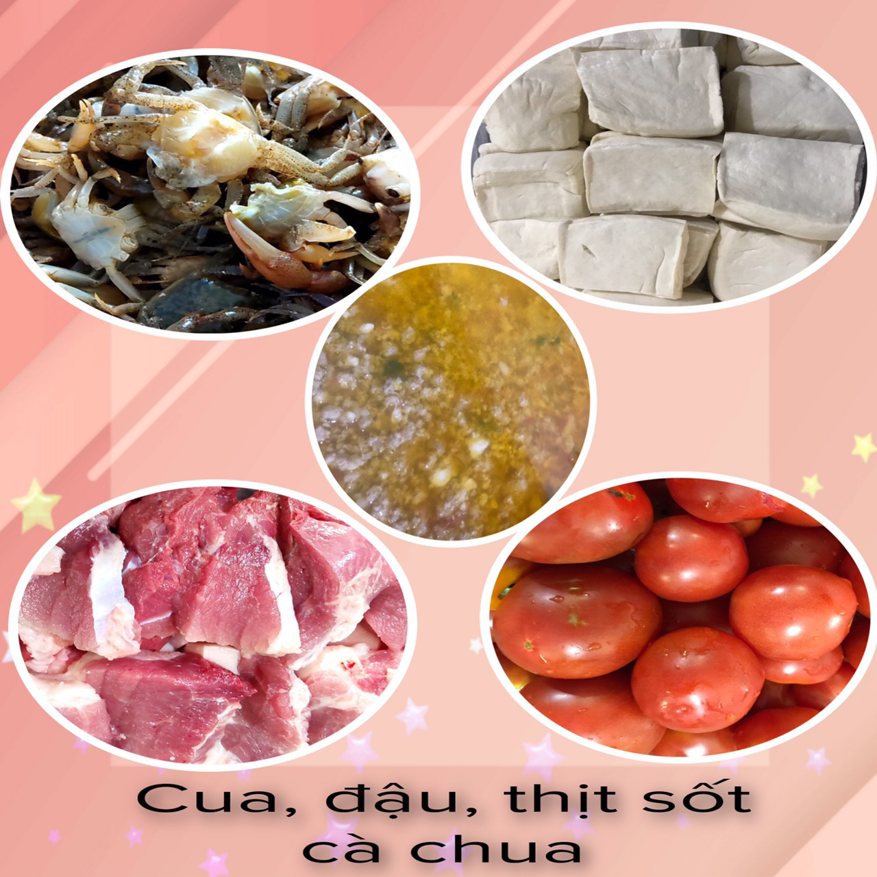 - Cua, đậu, thịt sốt cà chua