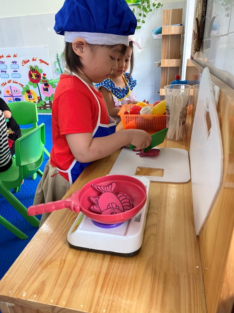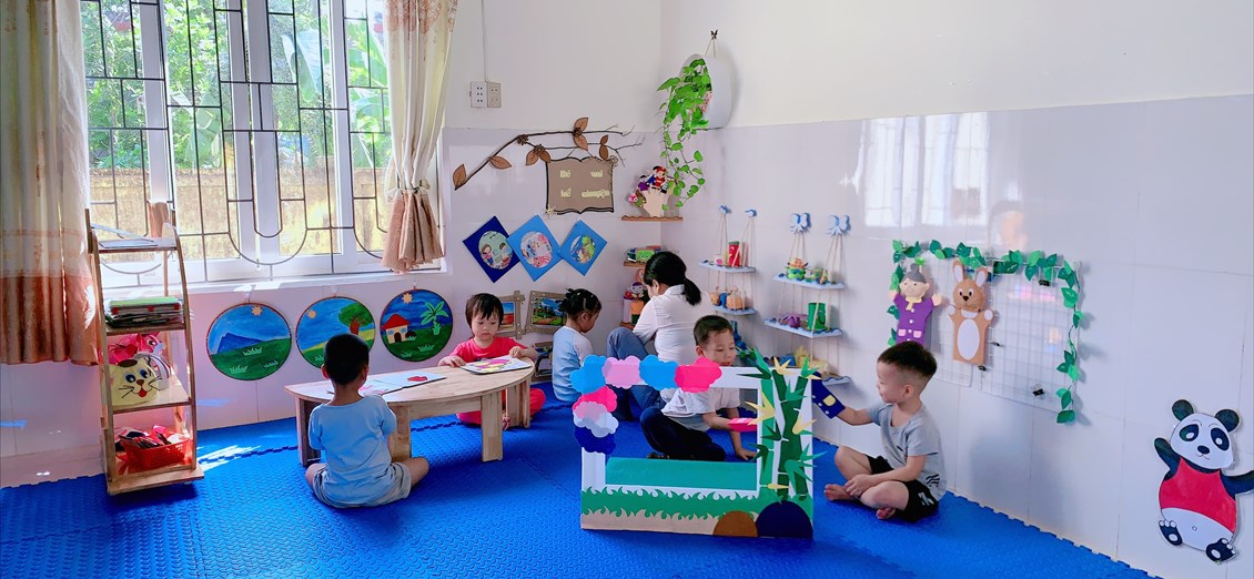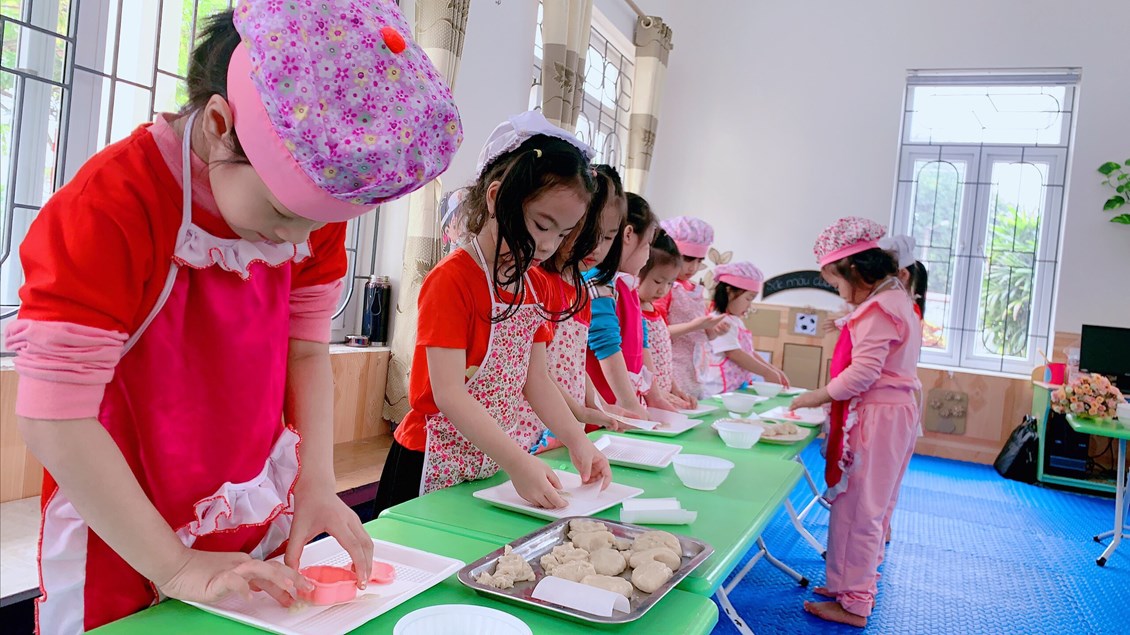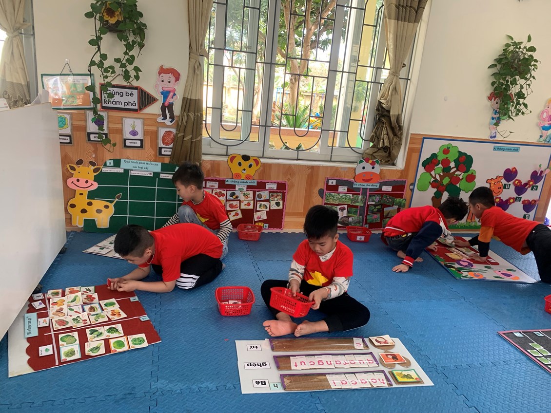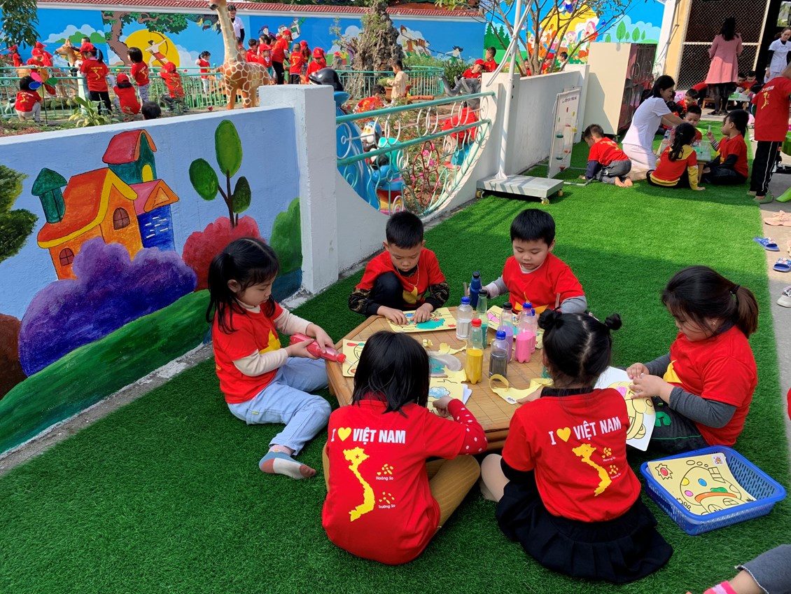 * Chơi hoạt động ở các góc: Đây chính là lúc một xã hội trẻ em được hình thành, bé được đóng vai làm bố, làm mẹ, làm bác sỹ, người bán hàng…Trẻ được chơi cùng nhau, cùng chia sẻ mục đích, ý tưởng chơi, cùng quyết định những gì trẻ muốn chơi. Sau khi chơi xong, các bé chủ động dọn dẹp cùng các cô giáo. Đây là kỹ năng quan trọng mà ở bất kỳ trẻ nào cũng cần phải học.