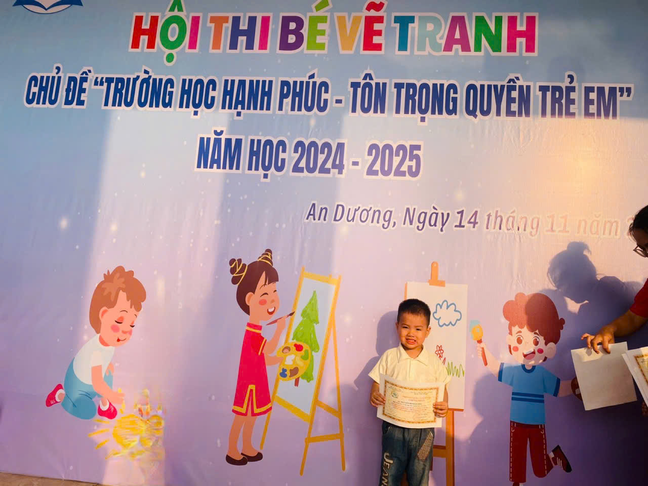 Sáng ngày 14/11/2024 bé Nguyễn Minh Dương đại diện cho 29 bé lớp 3 Tuổi C2 tham gia hội thi vẽ tranh cấp huyện với chủ đề "Trường học hạnh phúc, Tôn trọng quyền trẻ em" Đến với hội thi bé đã vẽ bức tranh về một ngôi trường thân thiện, an toàn, tôn trọng và yêu thương. Rất vui mừng khi bé đạt giải triển vọng trong của hội thi.