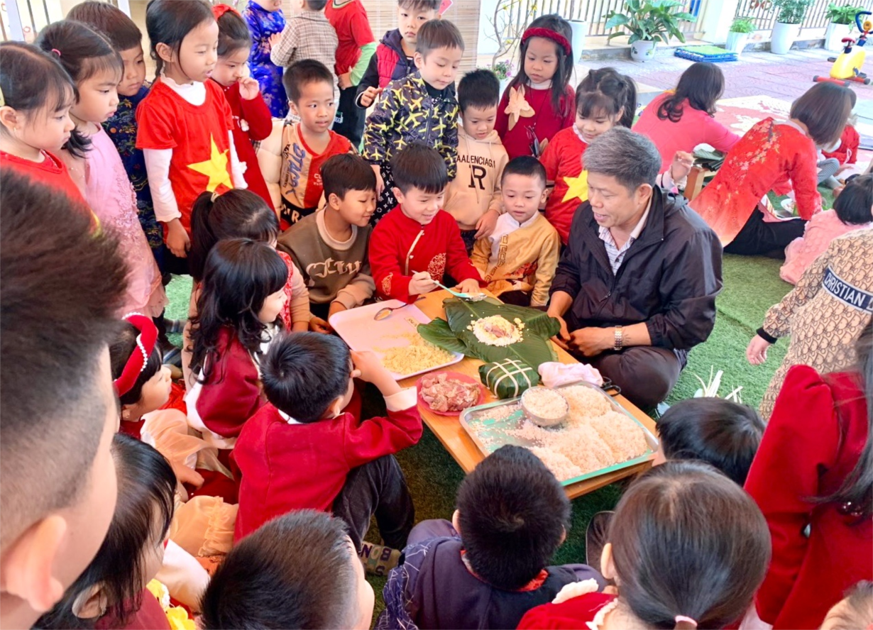 🥰Các con rất thích thú và phấn khởi khi được tự tay làm một chiếc bánh chưng xanh. Những chiếc bánh chưng vuông vắn, xanh mướt được các bác cấp dưỡng luộc chín, mùi thơm phức của gạo nếp, ngậy béo của thịt mỡ, màu vàng óng của đỗ xanh đã tạo nên hương vị đặc trưng, ấm áp của ngày Tết cổ truyền.