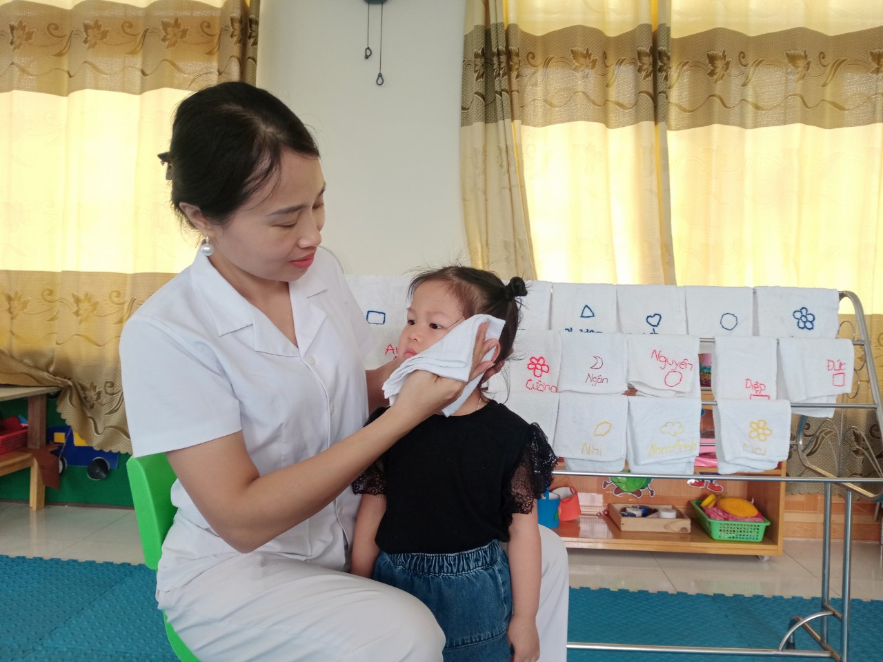 Để giúp bé vệ sinh an toàn và hiệu quả, điều đầu tiên các cô và phụ huynh phải rửa tay thật sạch. Chuẩn bị mỗi trẻ một khăn tay riêng và mềm mại, an toàn. Khi đã có khăn mặt và rửa tay sạch sẽ. Bạn nên trải khăn trên 2 lòng bàn tay, đặt hơi hụt vào bên trong cổ tay một chút sau đó tiến hành các bước rửa mặt cho trẻ mầm non.