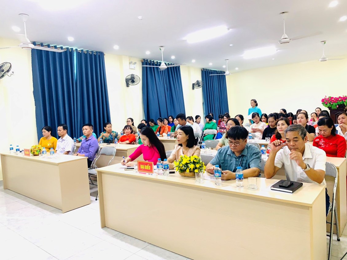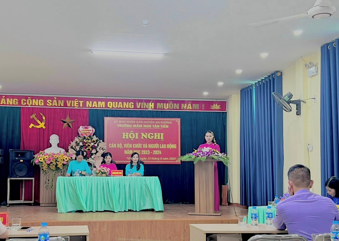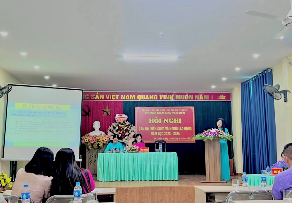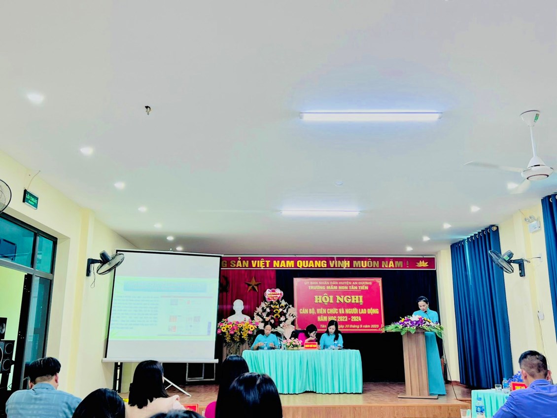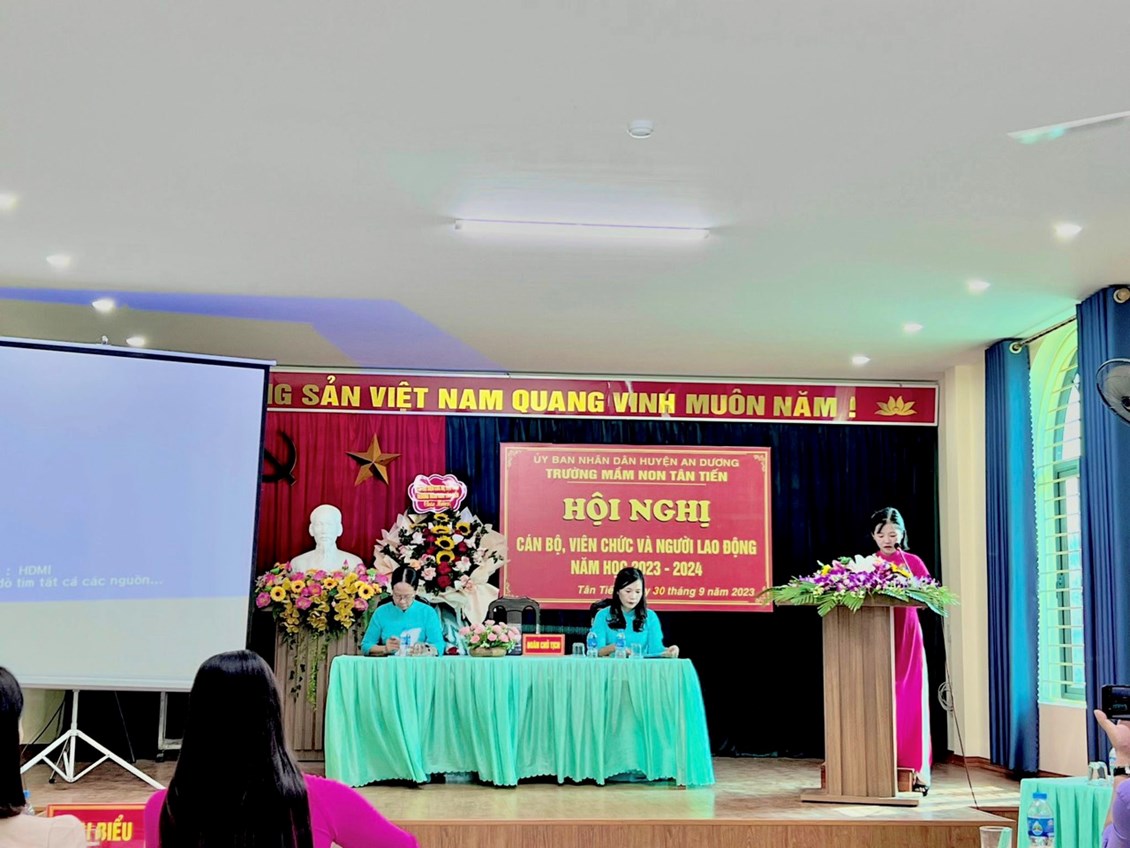 Hội nghị được xem phóng sự kết quả thực hiện nhiệm vụ năm học 2022 - 2023 và đồng chí Phạm Thị Sắm - Bí thư chi bộ, Hiệu trưởng nhà trường trình bày dự thảo phương hướng, nhiệm vụ năm học 2023 - 2024. Hội nghị đã nghe ý kiến tham luận của đồng chí Phó hiệu trưởng nhà trường với giải pháp "Đẩy mạnh ứng dụng công nghệ thông tin nhằm thực hiện tốt chuyển đổi số trong công tác quản lý nâng cao chất lượng giáo dục theo quan điểm lấy trẻ làm trung tâm" và đồng chí Phạm Thị Vân Anh với tham luận "Tổ chức tốt giờ ngủ cho trẻ nhà trẻ". Hội nghị đã được nghe ý kiến phát biểu của đồng chí Nguyễn Thị Huyền - Phó trường phòng Giáo dục và Đào tạo huyện. Tại hội nghị diễn ra lễ ký giao ước thi đua năm học 2023 - 2024 giữa nhà trường và công đoàn. Sau thời gian làm việc nghiêm túc và khẩn trường hội nghị đã đi đến biểu quyết thông qua các chỉ tiêu cơ bản của nhiệm vụ năm học 2023 - 2024 và thống nhất các kế hoạch, chỉ tiêu đề ra, hứa quyết tâm thực hiện bằng biểu quyết 100% ý kiến nhất trí. Hội nghị đã thành công tốt đẹp. Sau đây là một số hình ảnh trong hội nghị cán bộ, viên chức, người lao động Trường mầm non Tân Tiến: