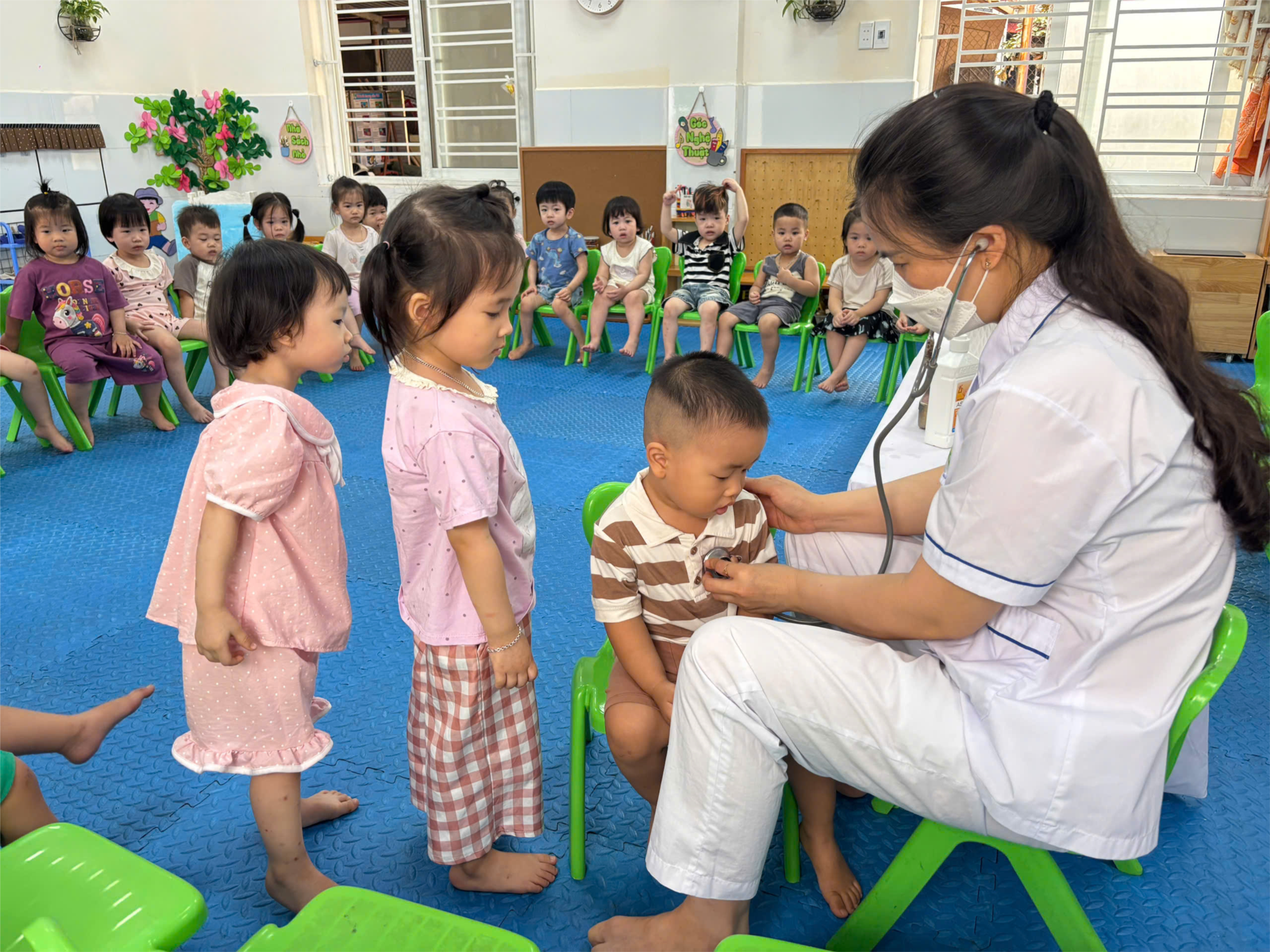 Dưới sự quan tâm, nhẹ nhàng của các cô y bác sĩ, các bé tuy còn chút bỡ ngỡ nhưng đều rất ngoan và hợp tác. Những đôi mắt tròn xoe, những cái nắm tay nhỏ xinh khiến buổi khám trở nên thật ấm áp.