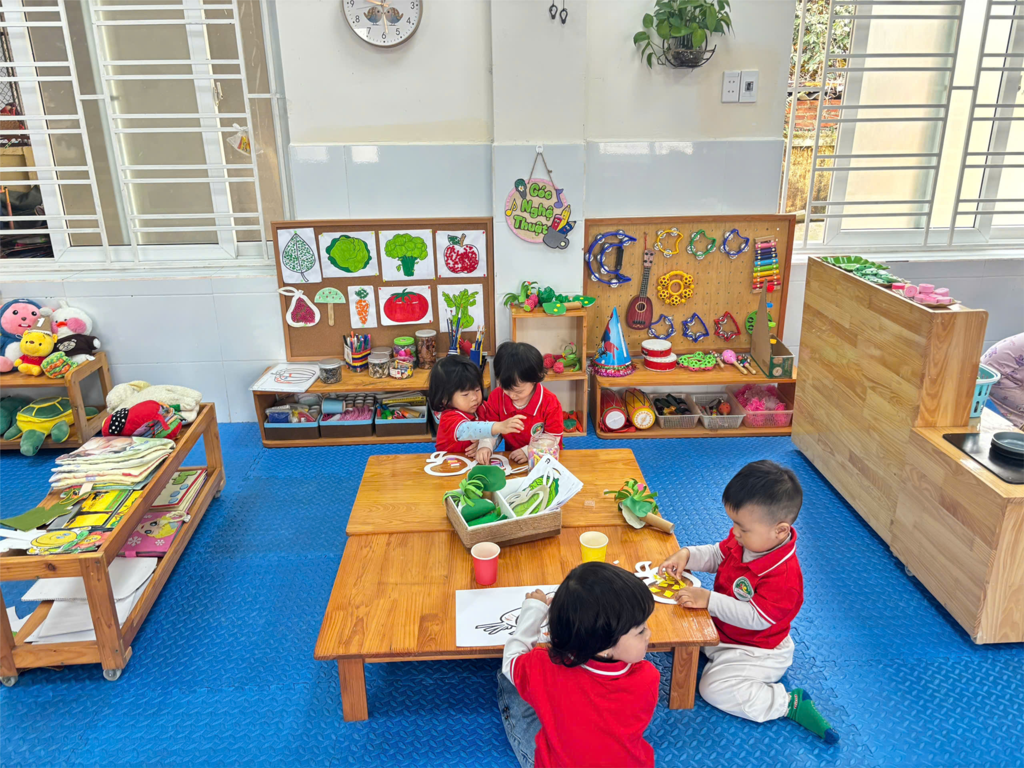 Các con được tự do lựa chọn góc chơi mình yêu thích như: góc hoạt động với đồ vật, góc xây dựng, góc nghệ thuật, góc sách… Mỗi góc chơi đều rộn ràng tiếng cười, những đôi bàn tay nhỏ xinh khéo léo xếp hình, nấu ăn, chăm sóc “em bé” hay cùng nhau trò chuyện.